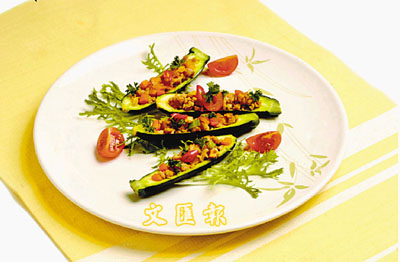 材料:溫室小青瓜4條;免治豬肉120克;紅蔥茸1湯匙;蝦米(切細碎)20克;西芹、黃椒、甘筍(切細粒)各15克;花生碎、芫茜各適量