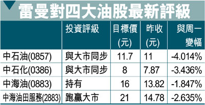 【本報訊】投資銀行雷曼兄弟昨指出,在油價升抵歷史高位後,已調低了亞洲石油及天然氣行業股份的評級,由「正面」調低至「中性」;同時把中石油(0857)和中石化(0386)的評級降至「與大市同步」,目標價分別降逾20%。