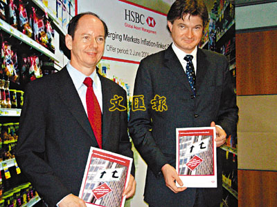 匯控(0005)旗下冀信匯資產管理行政總裁康柏進(圖右)表示,雖然環球經濟增長放緩,但新興市場經濟增長及通脹持續強勁,展望今年經濟增長(GDP)約7%,而通脹率(CPI)則高達6.6%,故該通脹掛鉤債券基金正可讓投資者捕捉新興市場通脹上升及強勁經濟增長帶來的投資潛力,該債券旨在每季派發股息,估計股息年率為7%至9%。