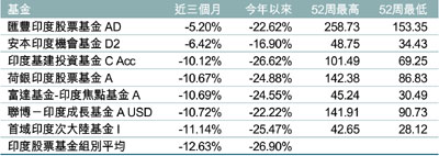 印度股市從年初調整以來,跌幅已近3成,在金磚四國中的表現敬陪末座,也使整個印度股市今年來市盈率下降33%,相比其他金磚三國市盈率下降10%至31%更為嚴重。有分析指出,印度政府為遏制通脹,推出多項措施可能損及該國原料大型製造商的利潤,是股指受壓的原因。不過基金界對印度經濟增長前景仍看好,所以不妨趁調整低吸。