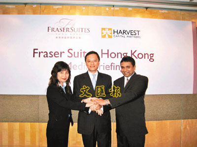 ■漢威資本管理行政總裁任榮(中)、輝盛國際管理行政總裁 Augustine M Silva (右)及輝盛閣總經理黃婉琴(左)推介輝盛閣。 本報記者梁悅琴 攝