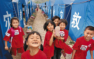 ■災區安置點的幾名兒童在「街道」上玩耍,原本互不相識的他們很快就成朋友。 新華社