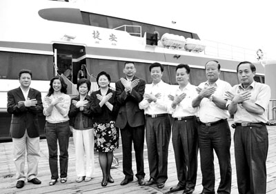 ■金門縣長李炷烽(右四)3日早上還到碼頭送行,晚上卻收到陸委會批准赴京的通知。 中央社