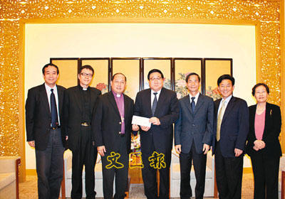 ■鄺保羅大主教把教友的愛心奉獻轉交中聯辦,由高祀仁接收。