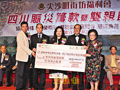 晚會上,理事長游俊英、監事長蘇仲平偕合辦機構負責人,將該會籌集的206萬餘元善款支票,遞交予油尖民政專員郭黃穎琦。郭專員說,未來災區重建十分艱巨,她希望各界的關心不止是一剎那的激情,而是細水長流的祝福。