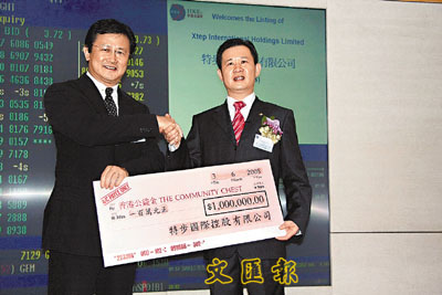 特步國際控股有限公司慶祝在聯交所主板上市,並成功獲得幸運股份代號「1368」,慷慨捐贈港幣100萬元予香港公益金,幫助社會上有需要人士。上市當天,特步國際控股主席兼行政總裁丁水波(右)將善款轉交公益金執行委員會副主席江焯開。