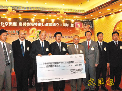 ■張學明、溫悅球、李連生、羅叔清代表聯會遞交160萬賑災支票予中聯辦副主任周俊明,新界工作部部長陳卓等。