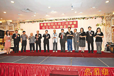 新僑南中大同三校聯會日前慶祝成立7周年聯歡聚餐,近400多人參加,香島、培僑、勞校、重生等友校代表出席餐會。會長洪啟暉致辭,祝願祖國主辦奧運成功,抗震救災進展順利。