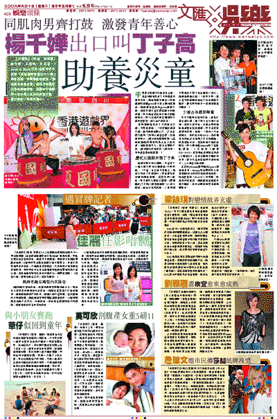 【本報訊】(記者 李思穎)楊千嬅、江若琳、吳日言、I Love U Boyz(艾粒)等歌手昨日出席「香港遊戲界賑災大行動」籌款活動,有關善款將捐到「聯合國兒童基金會」為四川地震受災學童重建校舍,活動中千嬅聯同二名赤裸上身的肌肉男打鼓,藉以激發一眾青年善心。