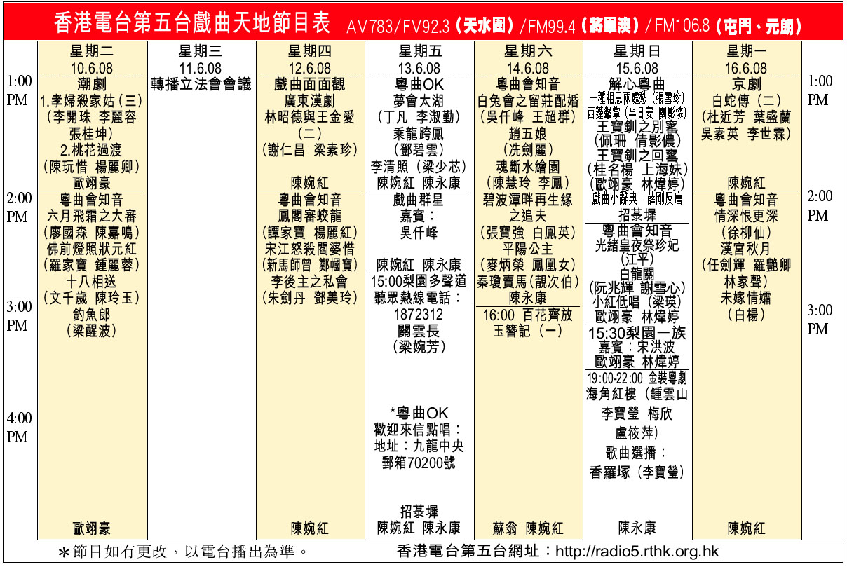 香港電台第五台戲曲天地節目表(AM783/FM92.3(天水圍)/FM99.4(將軍澳)/FM106.8(屯門、元朗))