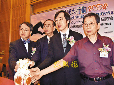 ■香港心臟專科學院的「心律健康大行動」揭幕禮上,陳藝賢(右二)呼籲市民控制血壓高、冠心病等,防患心房纖顫於未然。右一為張建樹。