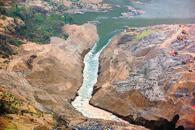 ■9日17時,可以從空中看到的堰塞湖泄洪渠水流越來越急,截至發稿,洪流量已達80.8立方米/秒。 新華社