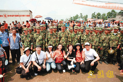 ■周美鳳(右三)及翁虹(右四)與當地軍人合照。