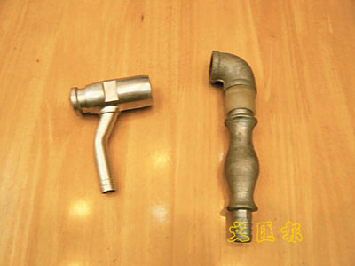 ■左為梁青平公司改進後的水閘(水龍頭),曾被英國樂施會評為同類救援器材第一名,右為老式水閘。