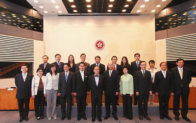 ■曾蔭權昨日率領8位副局長、9位政治助理與傳媒見面,會前先讓傳媒拍下大合照。本報記者曾慶威 攝