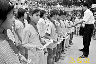 再跨進蕉樹中心小學的大門時,只見全校學生在操場整齊列隊,儀仗隊奏響歡迎樂曲,教學樓前掛起感激助學的條幅。蕉樹中心小學校長謝桂林,用帶著鄉音的普通話教導學生們:「我們蕉樹小學得到社會許多熱心人的幫助,希望大家今後更加努力學習。」學生們響亮地回應:「我們感謝叔叔阿姨們,給我們創造良好的條件。我們會聽從老師的教導,認真學習,做有用的人。」