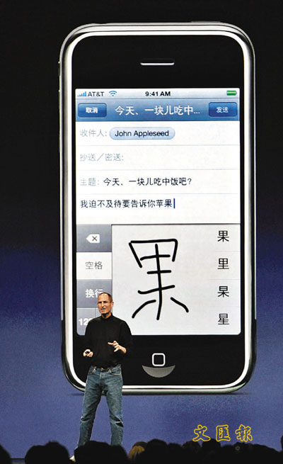 ■蘋果公司行政總裁喬布斯前日介紹3G版iPhone加設中文輸入法。 美聯社