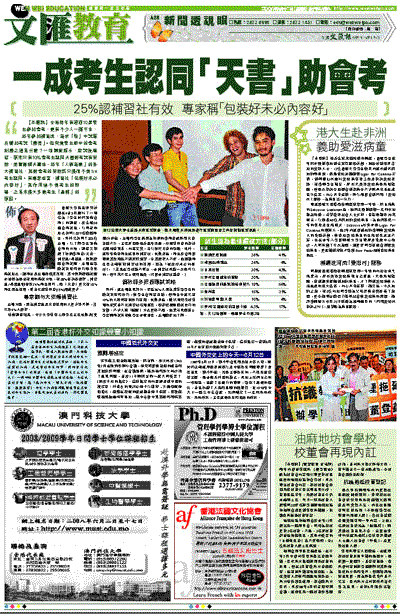 【本報訊】全港每年有超過10萬學生參加會考,更有不少人一擲千金,終年參加補習班,為求「貼」中試題及增加考試「勝算」。但究竟學生眼中的會考制勝之道是什麼?一項調查顯示,經試後總結,原來只有10%會考生認同天書對考試有幫助,而宣傳鋪天蓋地、終年「人滿為患」的各大補習社,其對會考的幫助就只獲得不到1/4考生認同。有專家坦言,補習社「包裝好未必內容好」,其作用達不到考生的期望,正是未獲大多數考生「青睞」的原因。