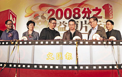 昨日,來自內地和香港的電影導演,包括謝晉(右二)、黃蜀芹(左二)、張一白(左)、王光利(右三)和關錦鵬(左三),以及學者余秋雨(右)一同在上海啟動《2008分之1》公益短片行動。《2008分之1》是為抗震救災而發起的公益短片拍攝行動,現已得到眾多導演的支持,日前陳凱歌已宣佈夥拍劉翔和姚明於美國拍攝,另外已確認參加本次公益行動的導演還包括顧長衛、王小帥、陸川、徐克等。 ■中新社