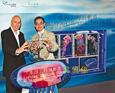 香港郵政於昨日在海洋公園舉行「水母」特別版郵票發布儀式。「水母」特別郵票1套6枚,郵票首次採用特別技術印刷,製造夜光效果,讓繽紛奪目的水母,在黑暗中更顯奇幻炫麗。這套特別郵票將由今日起在各郵政局發售。在同一場合,香港郵政獲大熊貓盈盈和樂樂「委任」製作郵品,以籌款支援內地重建大熊貓棲息地。此次籌得的款項將透過香港海洋公園保育基金的「大熊貓基地震後重建基金」,撥捐作震後受損大熊貓基地設施的重建工程之用。