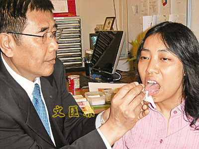 ■孫介光示範舌針,針刺舌頭穴道,可治療與腦有關的傷病,如中風、自閉症、腦癱,甚至「植物人」。本報記者梁嘉儀 攝