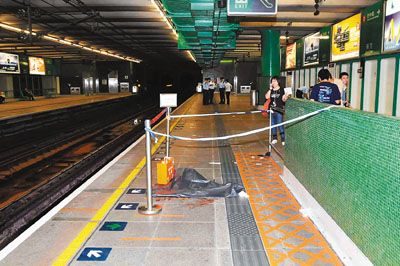 ■老翁在葵芳月台被撞死現場,警方將令人觸目驚心的血漬遮蓋。
