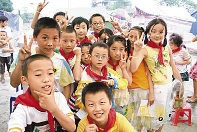 ■什邡洛水鎮洛水中學初一班的學生們,震災一月後初現笑容。 李東波、趙鵬飛攝