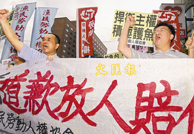 【本報訊】據中通社12日報道:12日上午,大批台灣漁民、家屬到台灣「外交部」抗議,不滿當局對日艦在釣魚島海域撞沉台灣海釣船事件的處理。同日上午,台北縣長周錫瑋前往日本交流協會抗議,要求日方立即放人、賠償損失並道歉。此外,台灣朝野立委以及傳媒輿論都大為不滿,齊聲痛批當局太軟弱。