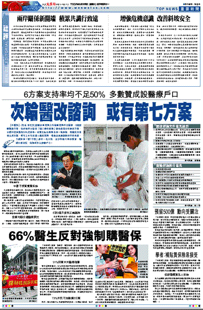 他又說,首階段諮詢期結束後,會每兩星期做一次民意調查,繼續了解各界的意見,6至9個月後會有第二輪諮詢,屆時綜合民意後,不排除會提出第7個醫療融資方案,但第7方案不會距離原本的太遠。
