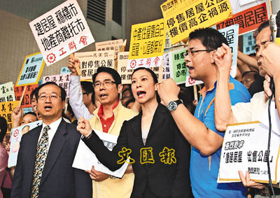 ■陳鑑林、黃國健等100多名民建聯、工聯會和公屋聯會代表,要求政府重新出售公屋復建居屋。 本報記者彭子文 攝