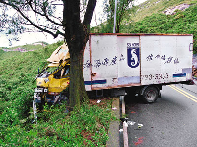 一輛運載傢俬的密斗貨車,昨晨8時許駛至石澳道彎位「跣胎」,失控剷越路壆後撞及路邊大樹,險翻下逾百米懸崖。幸尾輪遭石壆阻擋,貨車車頭擱於崖邊懸空。車上3人均浴血被困,後由消防員救出,送院時仍清醒。