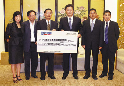 民建聯主席譚耀宗、副主席葉國謙、蔣麗芸昨日將333萬元的捐款支票移交中聯辦,由副主任李剛代表接收。連同上月19日送交的港幣540萬元,民建聯至今總共籌得港幣873萬多元,經中聯辦送交中央政府,用於四川賑災工作。