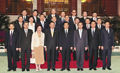 ■胡錦濤與海基會董事長江丙坤一行合照留念。 新華社