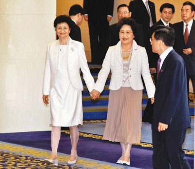 昨日9時,在中外媒體的聚光燈下,陳雲林夫人(左)與江丙坤夫人(右)攜手共同步入會場。更值得關注的是,兩位夫人同時身著白色套裝,這似乎是一種默契。由於現場媒體眾多,二人不時向對面的媒體微笑示意。