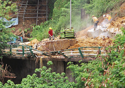 ■北角百福道發生山泥傾瀉,工作人員到場清理山泥大石。 本報記者溫瑞麟 攝