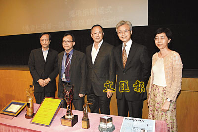 ■杜琪峰(中)出席香港電影資料館舉行的「杜琪峰電影獎座捐贈儀式」。