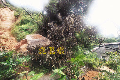 ■山洪沖下如私家車般大的石塊,幾乎滾進山邊村屋。本報記者蔣焯文攝