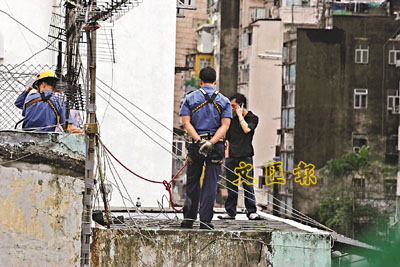 ■企圖跳樓男子不停撥打電話,消防「飛將軍」在一邊戒備。 本報記者蔣焯文 攝
