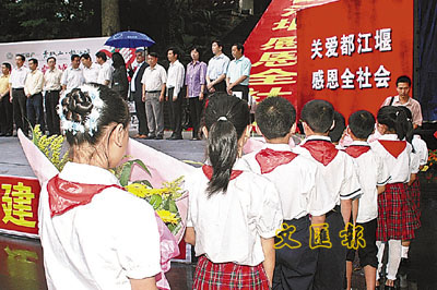■小學生準備向出席「關愛都江堰,感恩全社會」活動的代表獻花。本報記者李勇 攝