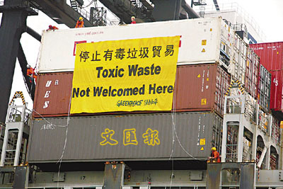 【本報訊】環保團體綠色和平9名成員昨日傍晚在葵涌貨櫃碼頭,堵截來自美國奧克蘭港的3貨櫃電子垃圾。初步相信,貨櫃內載有舊電路板及電纜等,計劃在本港卸貨後經陸路運往廣東三水處理。綠色和平項目總監盧思騁表示,有不法商人圖利用本港未有法例禁止廢棄電路板貿易的漏洞,經陸路運往內地處理,要求本港政府正視。環境保護署聯同海關昨日已到場跟進事件。
