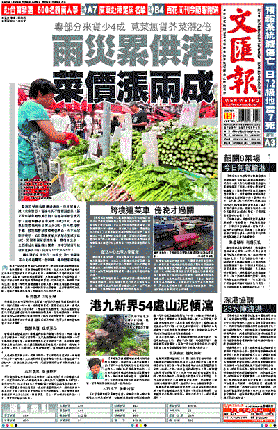 香港及華南地區連場暴雨,供港菜量大減,未來數日,香港市民不僅要捱貴菜,甚至有些菜有錢都買不到。香港蔬菜統營處表示,香港整體蔬菜來貨昨日減少1成,而蔬果批發價格則較正常上升2成,如天氣持續不穩,預料整體菜價短期仍高企。有本地菜販亦表示,近日廣東省部分蔬菜來貨減少近4成,莧菜等葉菜根本無貨,要增加北京、江西等地來貨量應付需求,其中芥菜每斤批發價更暴升2倍,由每斤1.5元升至5元。