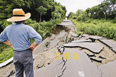 ■地震令道路崩塌下陷,一名男子望著被毀馬路欲過無援。 路透社