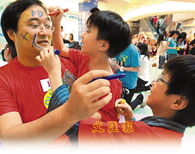 ■商場舉辦父親節活動,父子互相對畫「花臉」,玩得溫馨又開心。 本報記者李志樑 攝