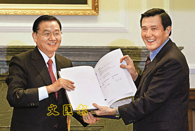 ■江丙坤並將此行海峽兩岸兩會簽署的協議書,呈給馬英九。 中央社