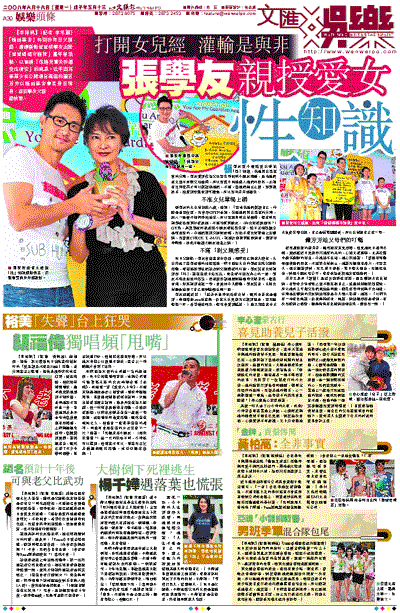 張學友的大女兒快將八歲,他謂:「要先教她們保護自己,什麼是重要位置,我會好OPEN去講,教過她們男女性器的分別,深入一點便不知何時開始教,所以要經常同女兒傾偈,佢有同我講學校邊個男仔受歡迎,不過唔係男朋友。(你女兒受歡迎嗎?)OK啦,其實學校和家長給小朋友灌輸性教育、給予正確性觀念是很重要的,令她們懂得分辨對或錯,我也不准女兒單獨上互聯網,我曾經CHECK E -MAIL,試過收到裸男宣傳網頁,嚇得即時刪除,故此不能讓小朋友胡亂上網。」