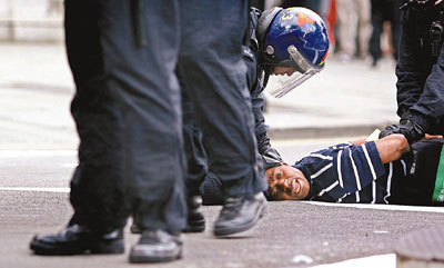 ■25名示威者被捕。圖為其中一人被警察按在地上。 法新社