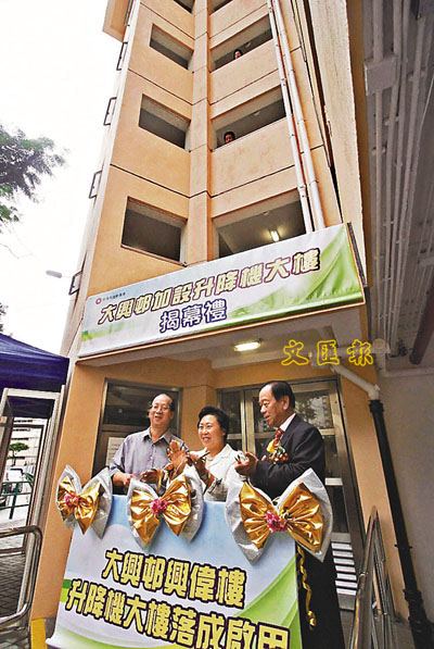 【本報訊】房屋署改善公屋居民的居住環境,其中一項新措施是在屯門大興h一座建成了近30年的住宅大廈,加建兩部升降機。運輸及房屋局局長鄭汝樺昨在其中一部升降機的啟用儀式上表示,有見及興偉樓居民當中不少是長者,為了方便居民出入,房屋署在興偉樓開展了增設升降機的工程。
