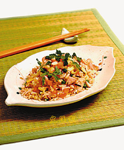 材料: 五穀米飯2碗;蒜片1湯匙;雞肉(切粗粒)120克;紅椒粒、甘筍粒、法國四季豆各29克;蛋2隻;松子仁2湯匙