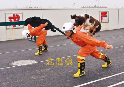 近日,天津消防津南支隊從南京警犬研究所和瀋陽消防支隊引進4隻消防搜救犬,以進一步提高搶險搜救能力。圖中消防搜救犬正進行技能展示。新華社