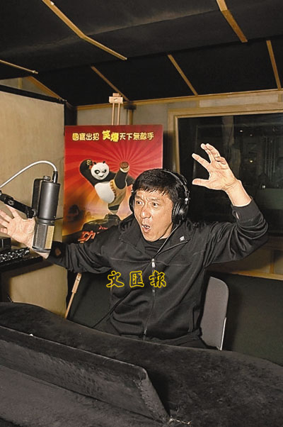 《功夫熊貓》快將上映,廣東話的配音陣容包括成龍(右)、房祖名(中)、陳奕迅(左)、何韻詩和李璨琛,其中成龍更為該片配上英語和普通話共3個版本,創下史上首位同時為多個地區動畫配音的藝人,更是他首次和兒子房祖名合作聲演。